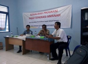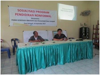 Pada sosialisasi tersebut, Ketua PKBM Generasi Amanah Indra Prawira, ST menjelaskan tentang berbagai layanan pendidikan nonformal, seperti pendidikan kesetaraan, pendidikan keaksaraan, pemberdayaan perempuan dan sebagainya. PKBM Generasi Amanah juga menjalin kerjasama pendataan warga masyarakat yang putus sekolah agar dapat mendapatkan layanan pendidikan kesetaraan Paket A, B dan C.